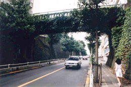 東横線をまたぐ陸橋が、学芸大学から都立大学駅の間に3カ所あります。一つは環状七号線で、あとの二つは、柿の木坂一丁目に架けられた陸橋です。この辺りは、荏原台と呼ばれる丘陵地帯の一部で、東横線はここでは高台を切り通して敷設されているため、陸橋は切り通しの上に架けられています。