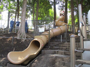 斜面を利用した遊具は、子どもたちに大人気。付近はかつての古墳跡ともいわれています。