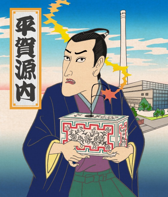燃えない布(火浣布)、温度計、万歩計などの発明品や原理もわからずエレキテルの修復に成功するなど、発明家としてのエピソードが有名。