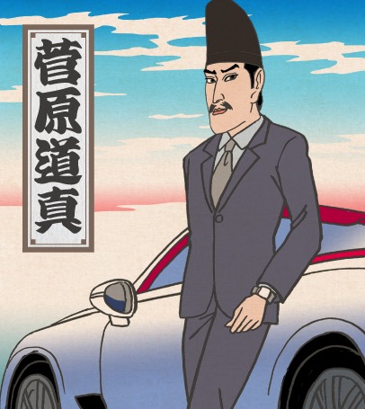 宇多天皇の絶大な信頼を得て、学者としては異例の右大臣となったが、いわれのない罪で大宰府へと左遷される。没後は長く学問の神様として信仰され、物語では、不思議な力によって現代の目黒区へ呼び寄せられ、学問を志す全ての人にエールを送る。