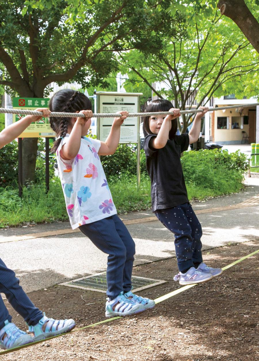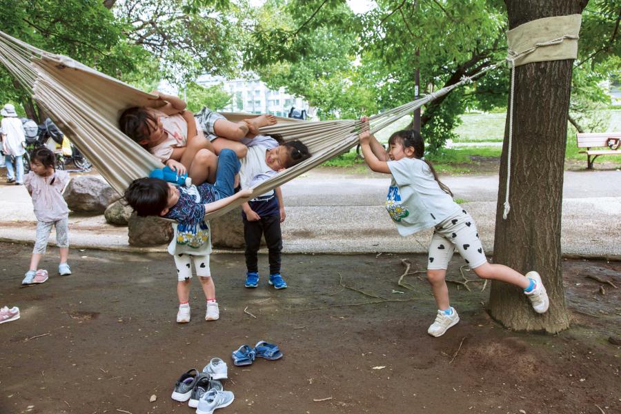 「ロープやハンモックでワイルドに遊んでいますね。のびのび遊んでもらいたいので、危険なことなど以外はあれこれ言いません。「あれはダメ、これは危険」と口を出してしまいがちですが、「いいよ、大丈夫だよ」と肯定することが、子どもも私もノンストレスで楽しいと思います。すると、子ども同士で「これやっていいかな」「いいよ」とやりとりしながら、ちゃんとルールを作って遊びます。