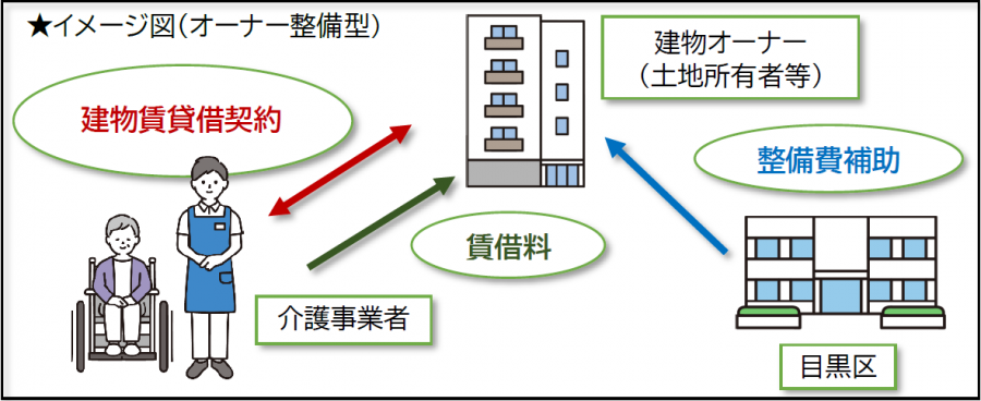 土地所有者が運営事業者の意向をもとに建物を建築し、当該運営事業者がその建物を賃借して介護施設として運営します。区は施設整備を行う土地所有者に整備費補助金を交付します。