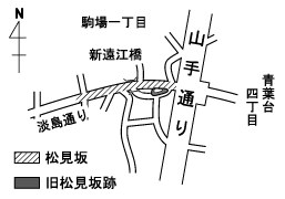 「昔、今の環六と淡島通りの交差する駒場一丁目付近に、道玄太郎という山賊がいましてね。その道玄がこの付近にあった松の大木に登って、旅人をねらっていたそうです。まあ、そんな話から、渋谷には道玄坂があり、道玄の登った松の大木を道玄物見の松といい、その名から松見坂という坂名がついたと、よく祖父から聞いたものです」と、土地っ子、宗田淳さんはいう。