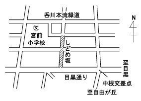 目黒通りから、八雲三丁目11番と12番の間を呑川緑道へ下る急坂をしどめ坂という。