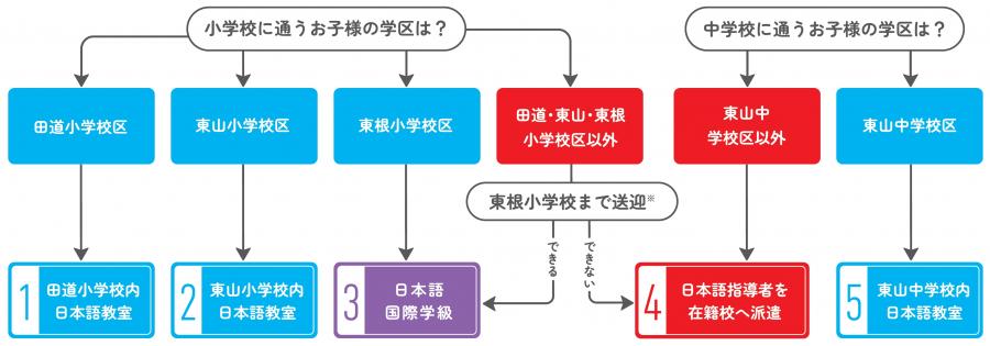 東根小学校、田道小学校、東山小学校の学区域以外にお住まいの児童及び東山中学校の学区域以外にお住まいの生徒に対しては、教育委員会から日本語指導者を派遣しています。