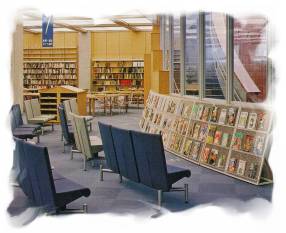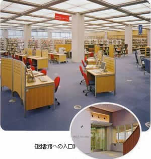 館内の各所にある利用者用検索機「さんまくん」では、資料の検索や予約をすることができます。「資料相談カウンター」「参考図書コーナー」があり、小説・文学、一般書の書架があります。