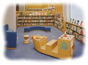 本の読み聞かせなどができるスペースや物語や調べものの本などの書架があります。児童コーナーの先はCDやYA(ヤングアダルト)の本のコーナーです。