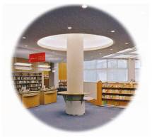 左側は「貸出・返却カウンター」、右側は「新着図書コーナー」、「テーマ展示コーナー」です。中央の柱には、貸出申込書などの記載台があります。