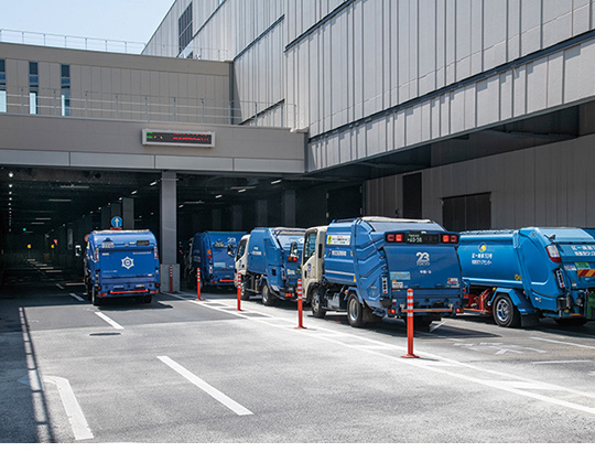 ごみ収集車が構内道路のトンネルにどんどん入っていくよ |