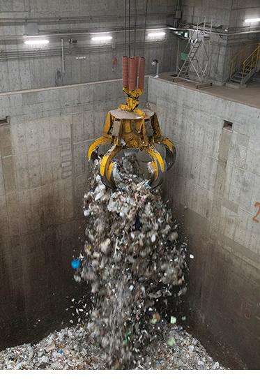 Q クレーンがつかんだごみを、すぐに落としている!壊れているの?ごみは燃えにくいものと燃えやすいものが混ざっています。クレーンでかき混ぜることで均一化し、効率よく焼却できるようにしています。 |