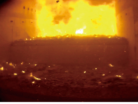 Q ごみを燃やすために、たくさんの燃料を使っているんだよね?燃やす前に、焼却炉内の温度を上げる時だけ都市ガスを使い、その後は燃料を使わずに、ごみと空気だけで燃え続けます。 |