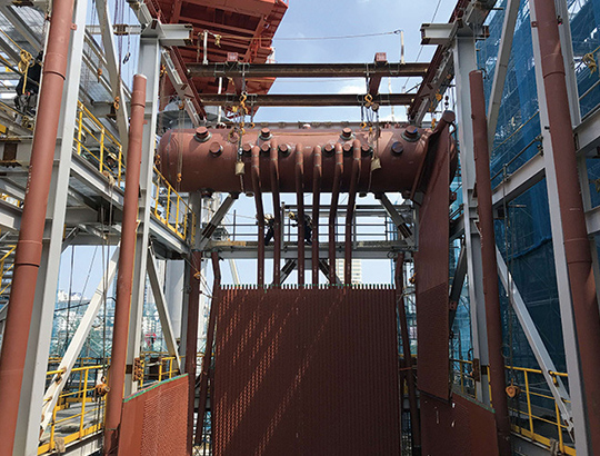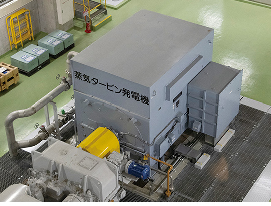 最新の蒸気タービン発電機。発電出力は、旧工場の約2倍もあるんだよ |