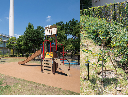 Q 隣にある公園も清掃工場の施設だってホント?公園のように見えますが、住宅地と距離を取り、騒音などを抑えるために設けている緩衝緑地です。遊具などを設置し、開放しています。 |
