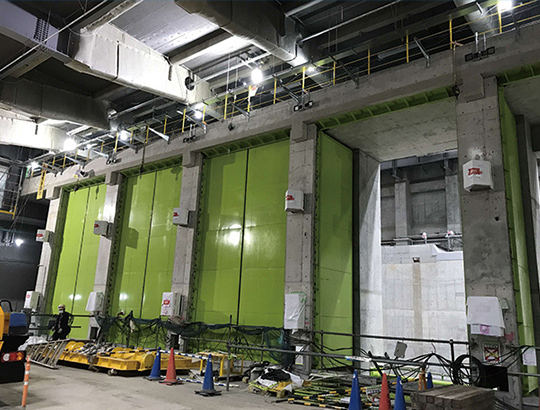 Q たくさんのごみが運ばれているのに、臭くないし、すごく静かだよ! なんで?ごみの臭いが外に漏れないように、出入り口に高速シャッターやエアカーテン(注釈)などを設置し、ごみバンカの空気は焼却炉に送って臭気成分も焼やしています。また、防音壁や工場棟の地下化のほか、トンネル状にした工場内をごみ収集車が走るようにすることで、走行音と臭気の抑制を図っています。 (注釈)空気の幕をつくって内外を遮断する装置 |