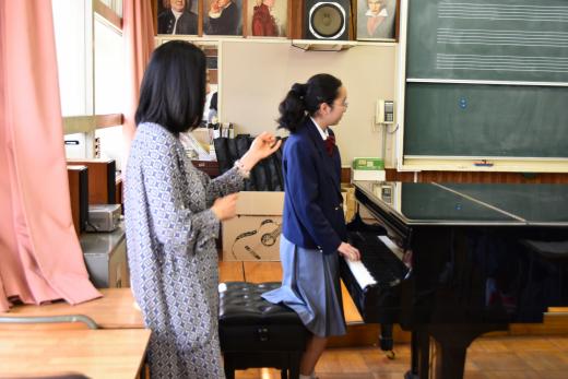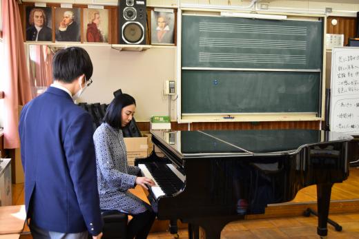 今回は、鼻歌ではなく、音楽室にあるピアノを使って、音を当ててみることになりました。ピアノを弾くのは難しいと感じる生徒が多かったので、植村さんがメロディーを弾いて選んでみることになりました。