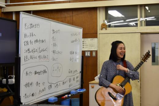 生徒たちの多数決で、曲構成が「Aメロ+サビ」に決まり、サビに繋がるAメロの歌詞もみんなで書いてみることになりました。与えられた課題に真剣に取り組む生徒の皆さん。そんな中で、聞こえてくるアコースティックギターの音色…これはいよいよ…筆者も生徒もその場にいた職員や保護者の方も高揚感に包まれました。