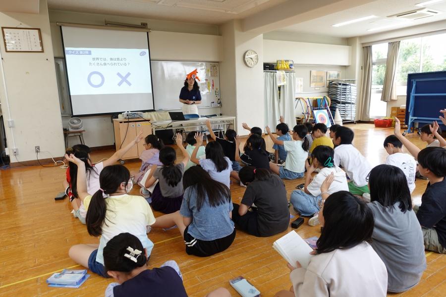 皆さんは、毎日の生活でどれくらい魚を食べているでしょうか?魚が苦手・食べられないといったことがなければ、多くの家庭の食卓でよく食べられているのではないでしょうか。実際、子どもたちに質問した時もほとんどがよく食べると手を挙げていました。 このように世界中で魚を食べる量が年々増え、60年間でなんと4倍(!)に増えています。その一方で「持続可能なレベル」を超えて漁獲されてしまうことで、今まで食べていた身近な魚が食べられなくなってしまう可能性があるといったお話でした。振り返ってみると、もうすでに、普段の生活でそのような状況を体感することが増えてきているような気がします。