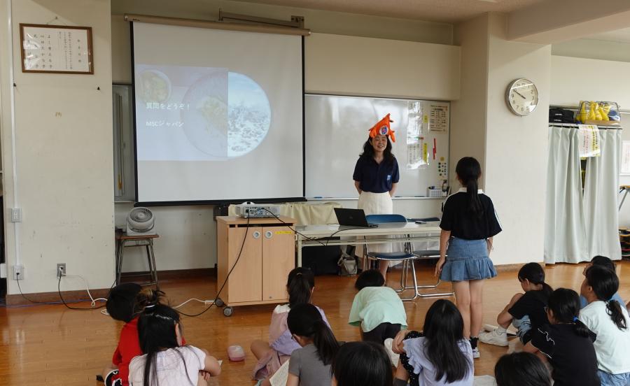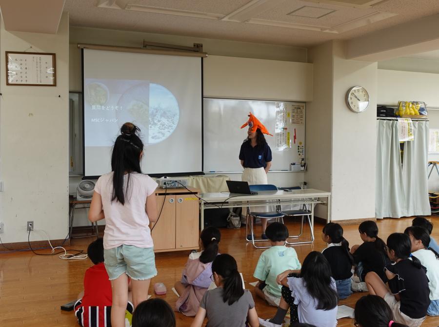 話は、クイズを交えて進められます。「MSC 海のエコラベル は何のためのラベル?」「日本で獲れる量が減っている魚はどれでしょうか」「MSC 海のエコラベル はどんなものについているでしょうか」そんな問いに子どもたちの正答率は高く、大人よりもずっと現状に詳しいのではないかと思えました。