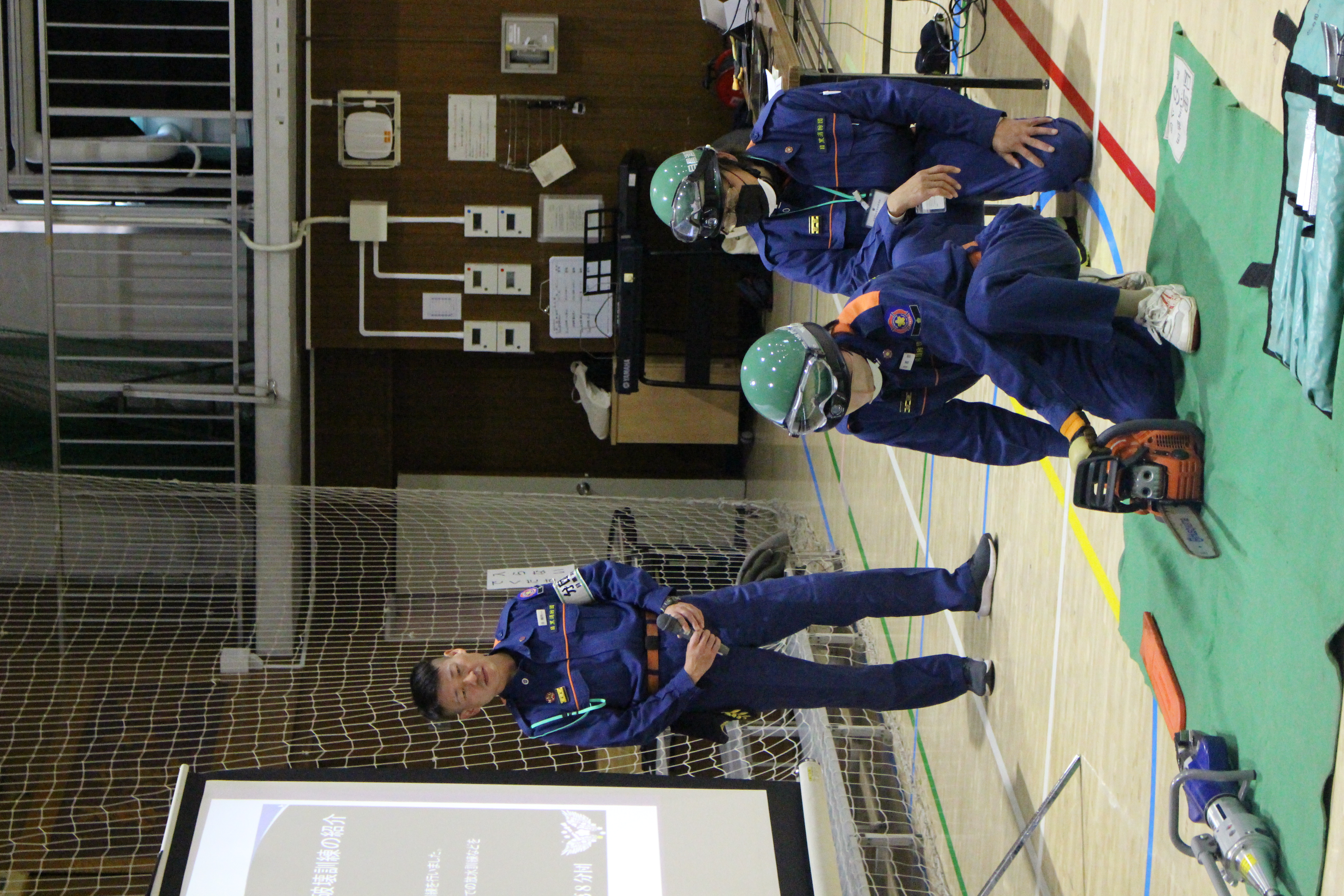 中でもエンジン付きの燃料を要する資機材は定期的に点検が必要ということで、チェーンソーのデモンストレーションを実施しました。