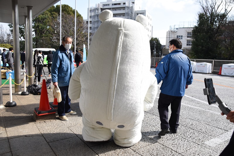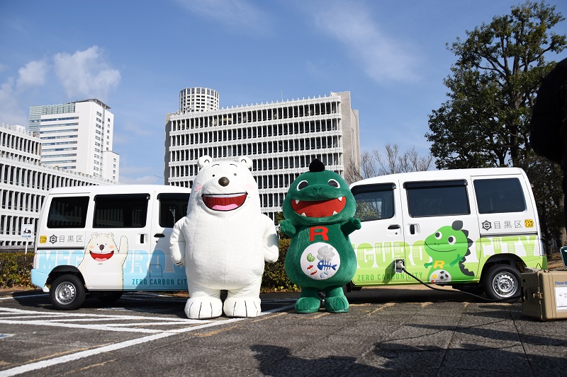 しかし、そんな日々もついに突如終止符が打たれる時が!それは、目黒区が去る1月23日に日産自動車株式会社・日産東京販売株式会社と協定を締結したことがきっかけでした。目黒区は令和4年、2050年のゼロカーボンシティの実現を打ち出し、ZEV(Zero Emission Vehicle)の導入や、ZEVに蓄えた電力を家庭用電源として利用するV2H(Vehicle to Home)の普及啓発など、地球温暖化対策の強化を掲げました。その具体策の一つとして本協定を締結し、日産クリッパーEVを庁用車に採用してEVの普及促進を行い、また災害時避難所における電力供給業務を円滑に実施することを計画しています。この協定のイメージキャラクターにフロートくんが大抜擢されたことで、長年留まっていた二次元の世界からついに飛び出してきたのです。