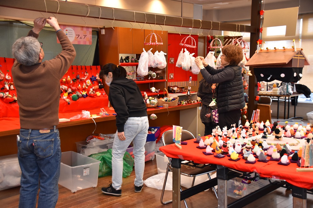ほかの作品展示もどう見せるか、どこに置くのかなど工夫を凝らしながら設置したあと、つるし飾りが設置されます。収納するためにビニール袋の中に包まれていた色鮮やかな飾りが姿を現すと、また一段と会場に華やかさが増しました。
