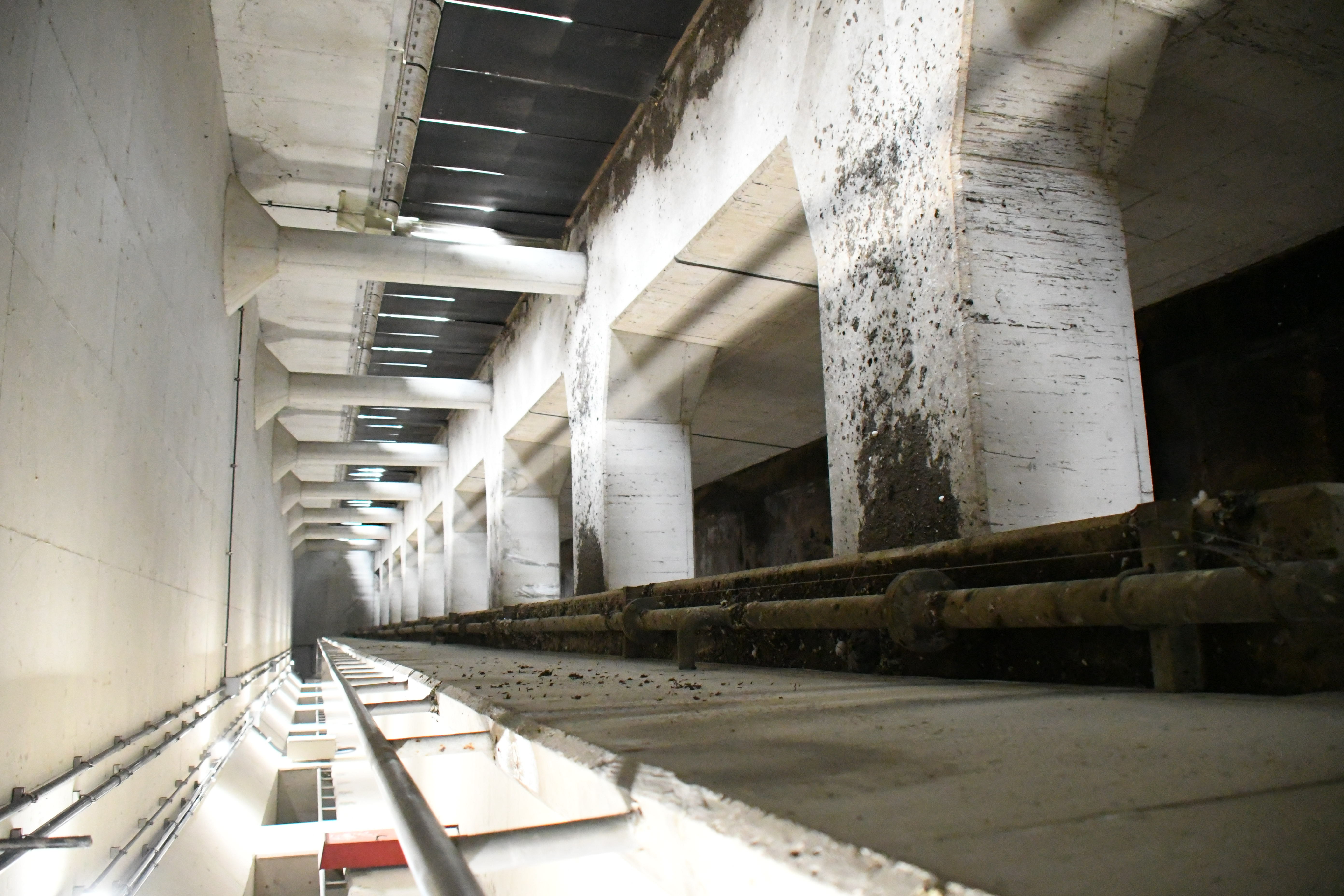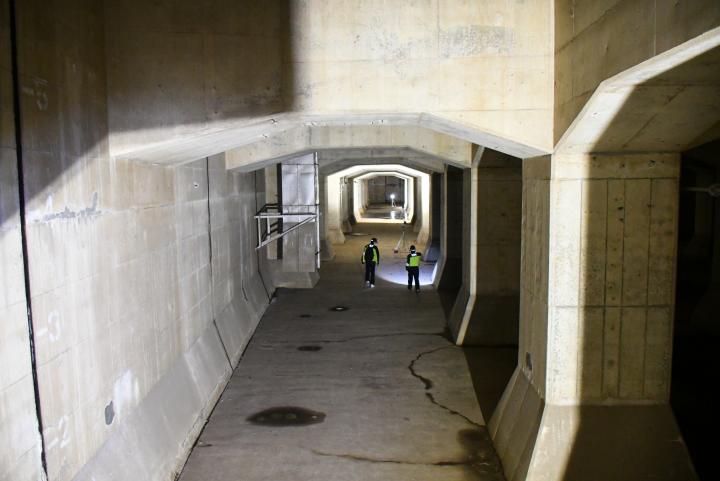地上から調節池まではエレベーターがないため、内部を見学する場合は、およそ8階建ての建物に相当する高さを階段で上下することになります。
