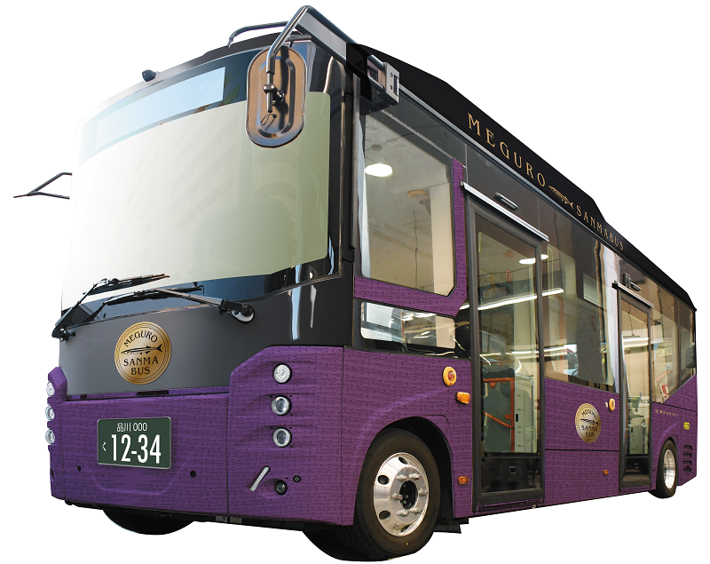 運行ルートが、落語「目黒のさんま」の舞台となる茶屋坂や、さんま祭の田道エリアを走ることから、東部地区の地域交通バスの愛称を「さんまバス」としました。バスのラッピングには、区の紋章色(江戸紫)をベースにさんま柄の模様を描いています。