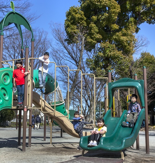 坂の多いまち目黒の高低差を利用した遊具がある公園は、紙面で紹介した中根公園の15メートルの滑り台だけでなく、不動公園や上四児童遊園、大塚山公園にもあり、子どもたちに大人気です。