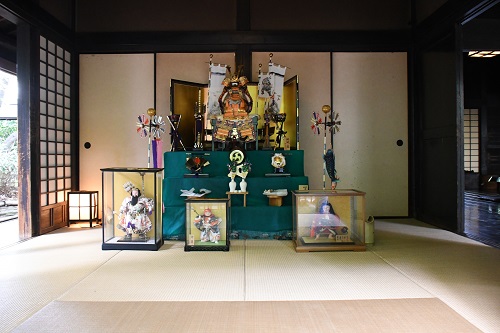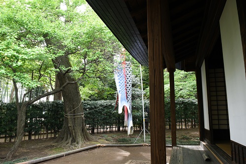 竹林の奥にある、すずめのお宿緑地公園の古民家では、四季折々の日本の伝統行事を行っていて、この時期は五月人形とこいのぼりを飾っています。