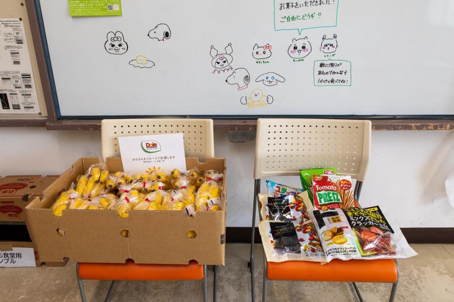 食材の一部は、近所の企業や地域のかたから寄付をいただいていて、実際にいただいた食材からメニューを考えているそうです。また、子どもたちが遊ぶおもちゃなども寄付を受けていました。