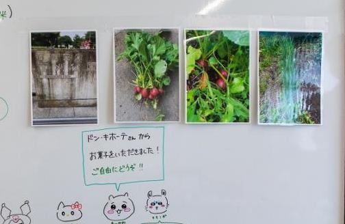 まると食堂は、区報紙面にもご登場いただいた石井さんが、地域企業などに声を掛けたりして食材を寄付していただくこともあるようです。今回の取材時にも、菅刈公園の畑で栽培されたラディッシュの寄付を受け、調理に生かしていました。