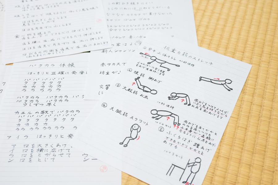 メンバーのかたが、トレーニングの動作をイラストにしてそれを見ながら、けがをしないようにゆっくり行います。