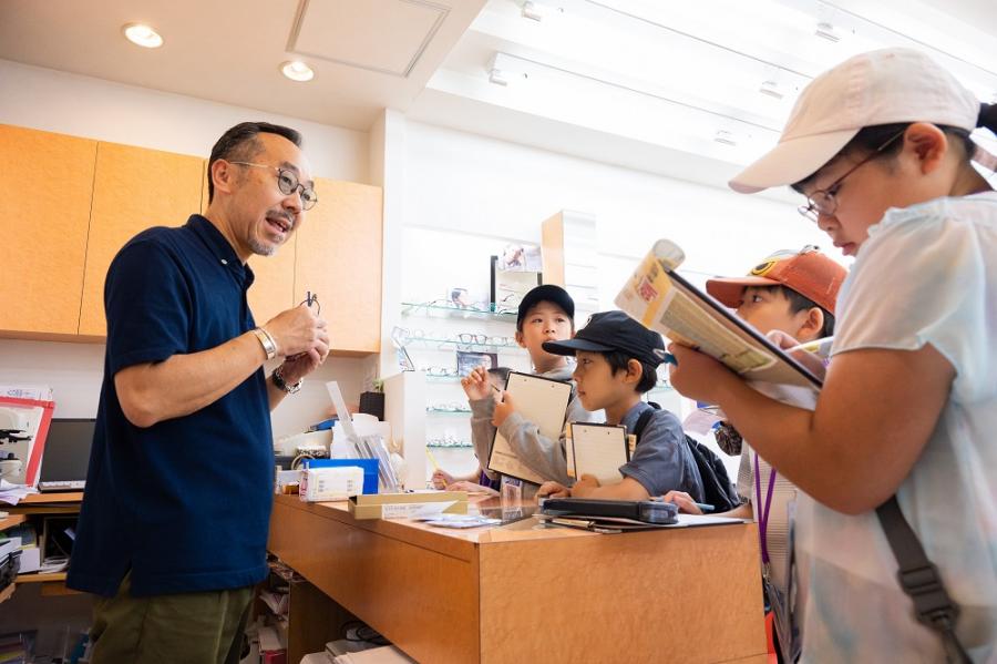 眼鏡店の「白光堂」を取材した子どもたちは、店主に「ここのお店はいつからやっていますか」「眼鏡は何個置いてありますか」など各自気になることを聞いていました。質問していると、店主が、特別に地下にあるレンズの加工部屋まで案内してくださり、レンズの加工方法について詳しく教えていただきました。