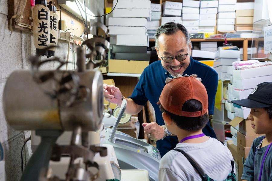 一方、和菓子店「喜風堂」を取材した子どもたちは、さまざまな和菓子が並ぶショーウインドーに終始夢中でした(笑)こちらは、3代続く歴史あるお店です。人気のメニューは、どら焼きで、コーヒー・あんこ・レモン味の3種類。某有名テレビ番組でも紹介されていました!