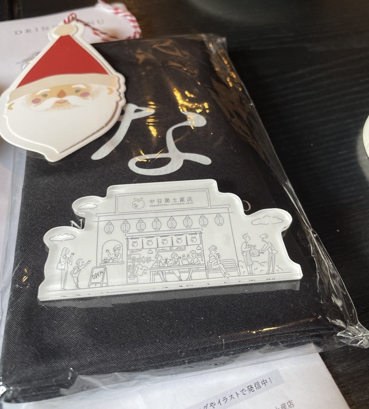 お店の前には、花畑さんたちが製作する、中目黒にちなんだオリジナルグッズが並べてあり、店内はバーカウンター数席と二つのテーブルがあり、コンパクトでアットホームな空間となっていました。