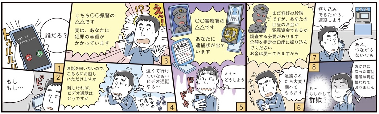 詐欺電話は、いつかかってくるかわかりません。事前に実例や対策を把握しておくと、慌てずに対応できる可能性も高くなります。また、「他人に言うな」などと口止めされても決して一人で解決しようとせず、ご家族など身近な人や警察にすぐに相談することがとても大切です。