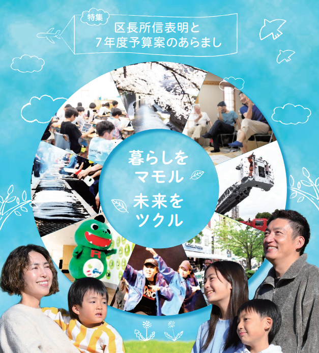 今回の表紙の真ん中にあるのは、区内のさまざまなシーンを組み合あわせて作った円グラフ。予算の内訳を示す円グラフがモチーフだって、気が付いていただけましたか?
