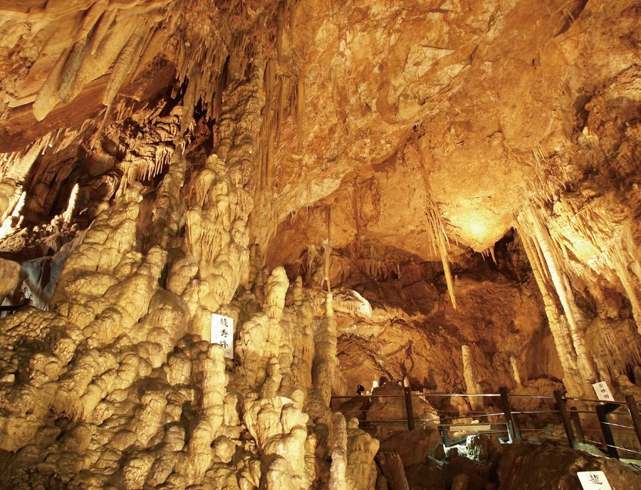 大正15年に発見された国指定の天然記念物。閉塞型であるため、外気の進入が少なく、風化することがありません。光沢がよく、均整のとれた神秘的な造形と色彩が美しい鍾乳洞です。