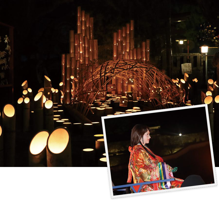 毎年11月上旬に竹ぼんぼりと竹オブジェのあかりが温かく彩り、訪れた人を城下町の幻想的な世界へといざないます。古くから伝わる真名長者伝説(般若姫の霊が両親と娘の待つ臼杵市へと里帰りする姿)を再現した般若姫行列の美しさは圧巻です。