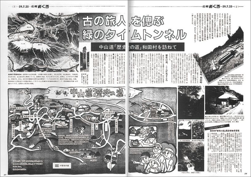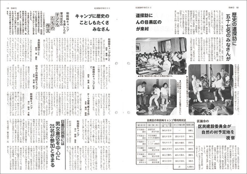 昭和59年には、建設予定地の和田村に視察も兼ねた1泊2日のバス旅行を企画し、当時の広報紙「広報めぐろ」で参加者を募集。このバス旅行に小学生から70代までの総勢57人が参加し、和田峠の歴史の道を散策する様子が和田村の広報紙「わだ時報」に掲載されています。