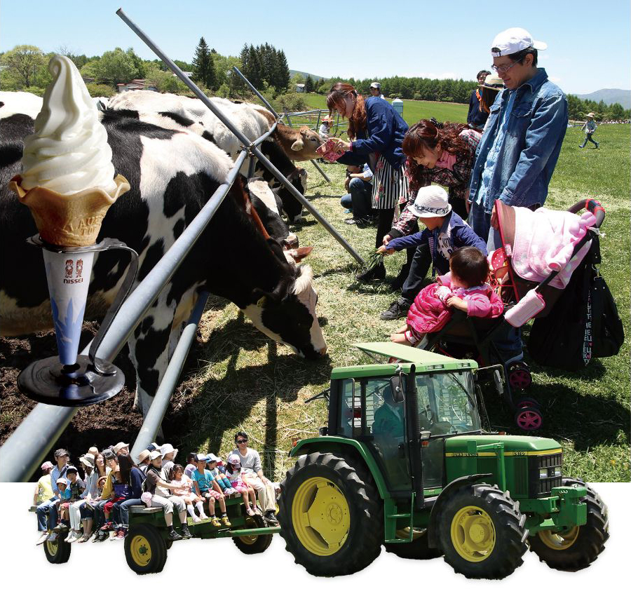標高1,400mの信州白樺高原に、東京ドーム45個分の用地を有し、200頭の牛を飼育しています。春から秋は牛や羊が放牧され、夏は草原をトラクターで遊覧したり、搾りたてのミルクを使ったソフトクリームを食べたりして、大自然を満喫できます。