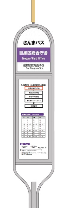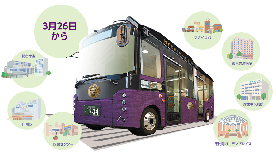 運行ルートが、落語「目黒のさんま」の舞台となる茶屋坂や、さんま祭の田道エリアを走ることから、東部地区の地域交通バスの愛称を「さんまバス」としました。バスのラッピングには、区の紋章色(江戸紫)をベースにさんま柄の模様を描いています。