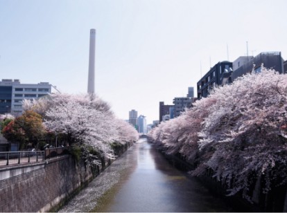 目黒川沿いの歩道には1キロメートルにわたり桜並木が続く人気のお花見スポット。最寄りのなかめ公園橋はドラマのロケ地としても使われています。