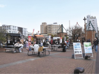 イベントスペース・まちのフードコート「ヒロバ」と、交流型コワーキングスペース「タテモノ」が融合した施設。「ヒロバ」には、ピザやケバブなどさまざまなメニューを提供するキッチンカーが集まります。