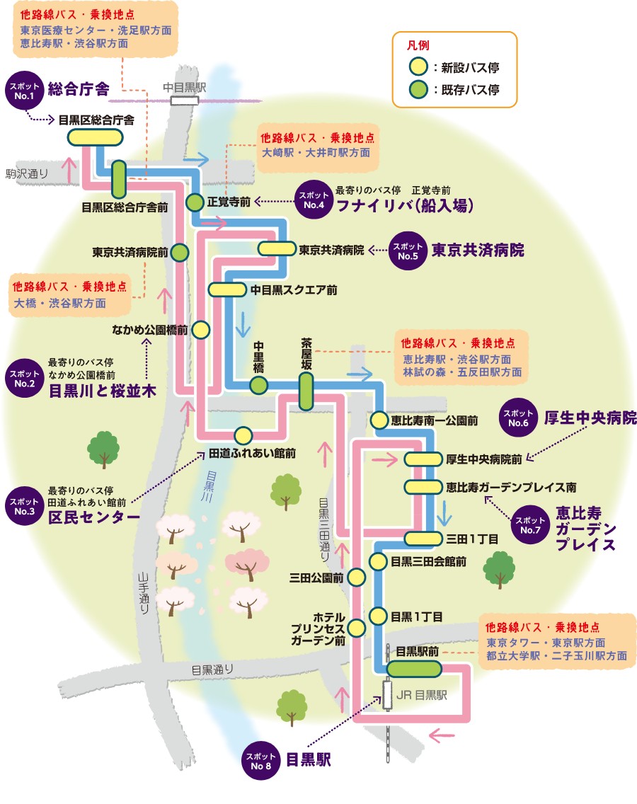 これまで公共交通が空白地域だった目黒三田通りを中心に、地域の皆さんと検討し、目黒駅から厚生中央病院、恵比寿ガーデンプレイス、東京共済病院を経由し、総合庁舎へのルートに、東部地区地域交通バス(愛称:さんまバス)を試験的に運行します。さんまバスに乗って、楽しく便利に出掛けてみませんか。