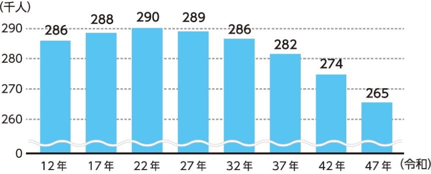 住民基本台帳等の人口数を基に出生・死亡率・転出入などを考慮して、将来の人口を推計したものです。国が発表している将来推計人口は減少する一方ですが、区の人口は令和22年がピークとなり、その後減少に転じる予想です。 |