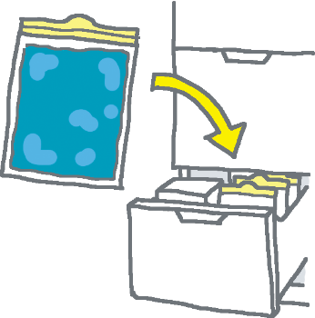 チャック付きの袋に水を入れ、冷凍庫の隙間を埋めています。冷凍効率を高めるだけでなく、停電時も少しの間は保冷剤になり、溶けた後は生活用水に利用できます。 |