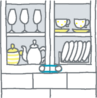 食器棚など観音扉の取っ手にヘアゴムをからめ、中の物が飛び出ないよう固定しています。 |