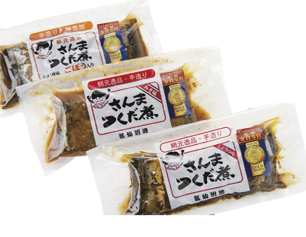 さんまつくだ煮(しょうゆ・みそ)。気仙沼産にこだわり、柔らかく仕上げています