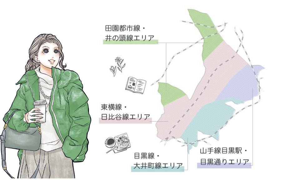 南北に長くのびる目黒区には、緑と住宅街、商業施設がバランスよく点在しています。開発が進む地域もあれば、昔ながらの雰囲気の街並みが残る地域もあります。